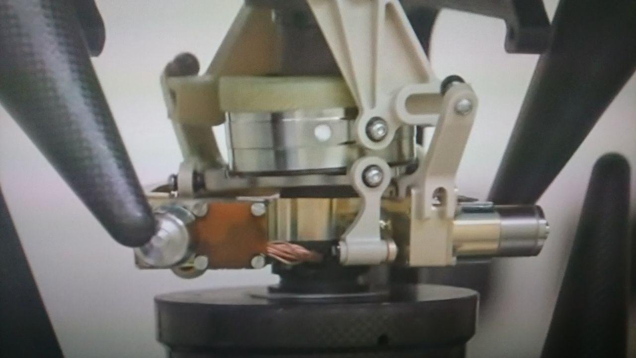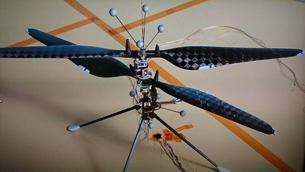Летающая модель для отладки автопилота. Шары указывают на применение оптической системы захвата положения и ориентации. Ноги эффективно пружинят при падении. Испытания проводятся в цилиндрической барокамере. Привязь применили вероятнее всего для выноса части веса аппарата, для компенсации разности гравипотенциала.